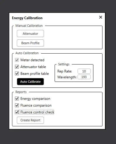 - Performs energy calibration across ALL achievable fluences and spot sizes